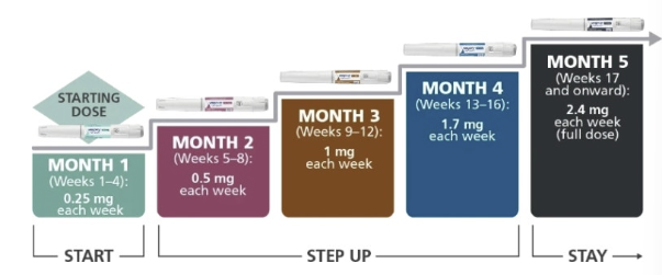 위고비는 주 1회 피하주사로 투여 합니다. 주로 복부나 허벅지에 주사하며 용량은 단계적으로 증량합니다.